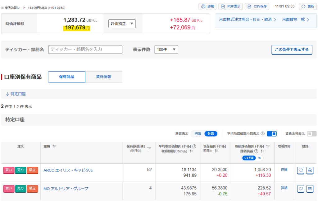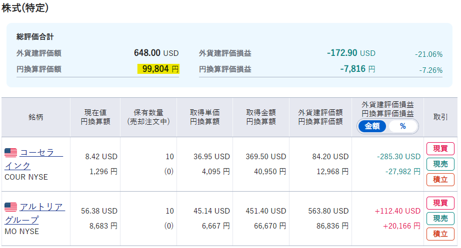 米国株式の保有銘柄と評価損益は以下の通りです。