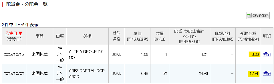 以下の通り、アルトリア・グループ、エイリス・キャピタルから合計$20.97の配当金を頂きました。