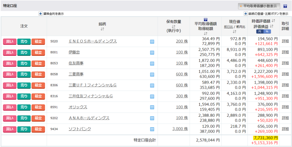 国内株式の保有銘柄と評価損益は以下の通りです。