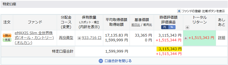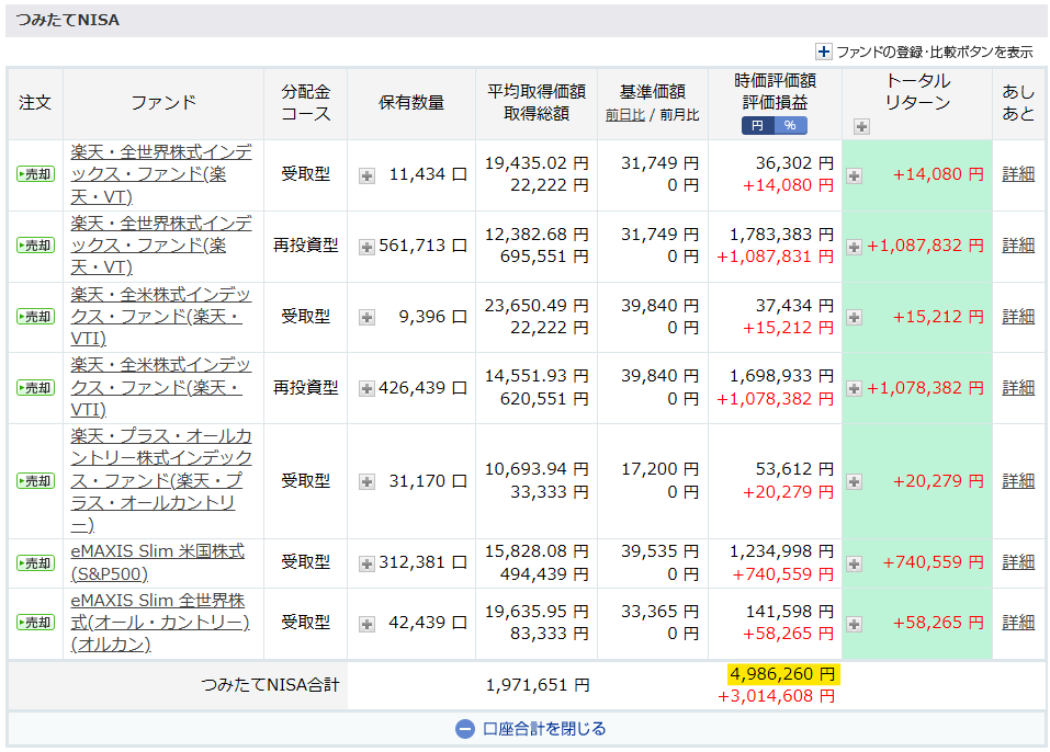 新NISAで投資しているファンドとトータルリターンは以下の通りです。