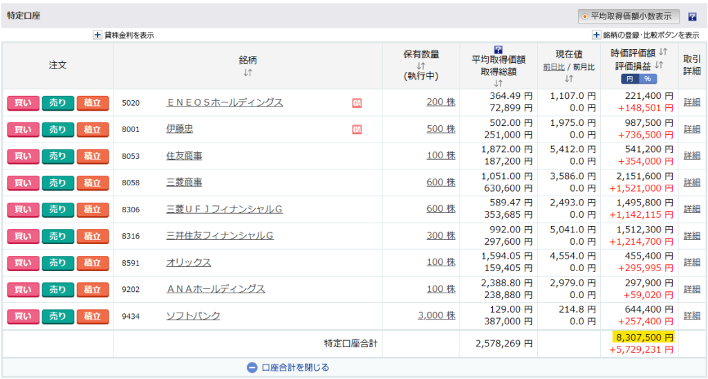 国内株式の保有銘柄と評価損益は以下の通りです。