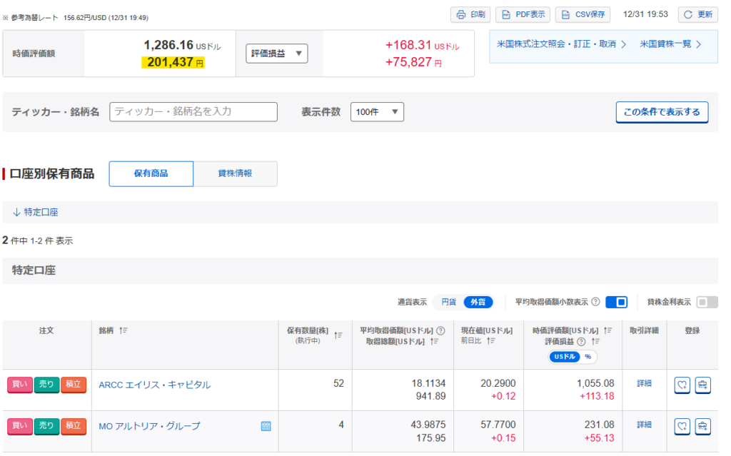 米国株式の保有銘柄と評価損益は以下の通りです。